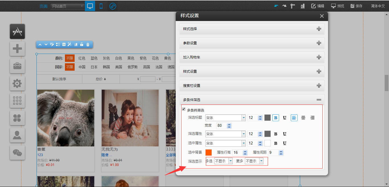 1.在后台中添加产品时,将已经添加好的“产品属性”选择完成,然后再编辑器中的“产品列表”中开启“多条件筛选”并将“多选”“更多”选择为“显示”状态(默认为不显示),然后点击保存即可,如图所示: